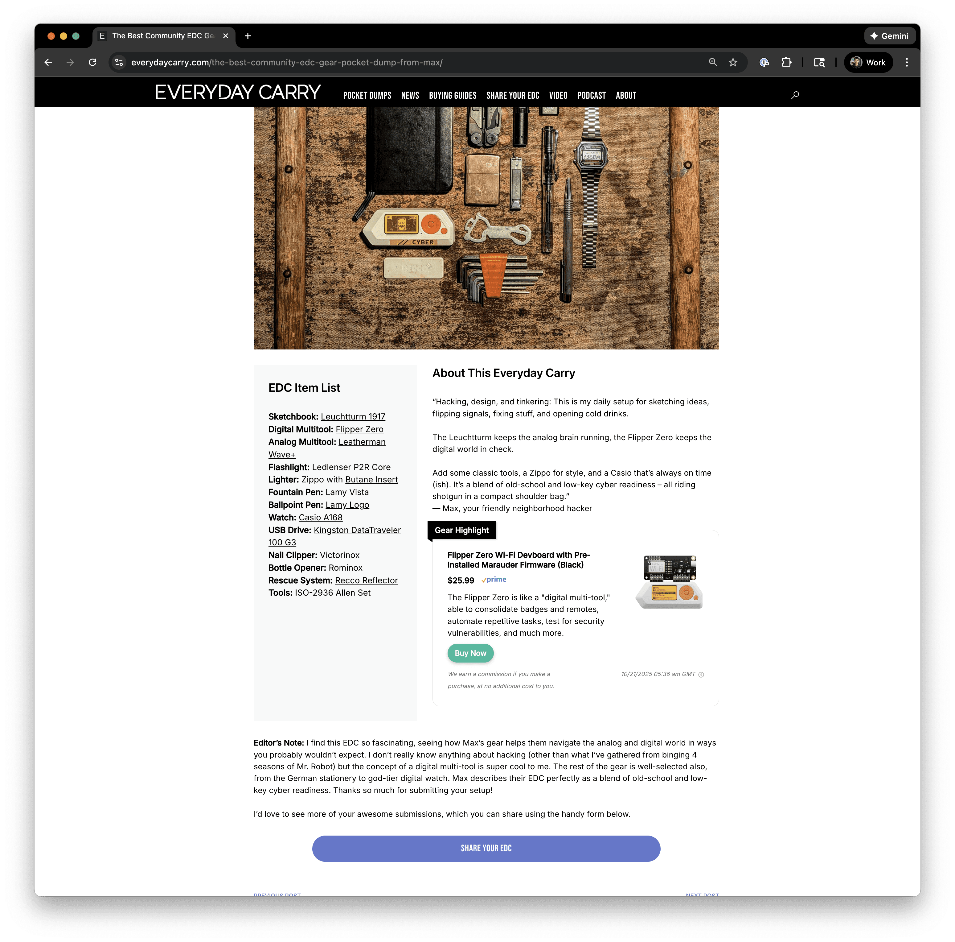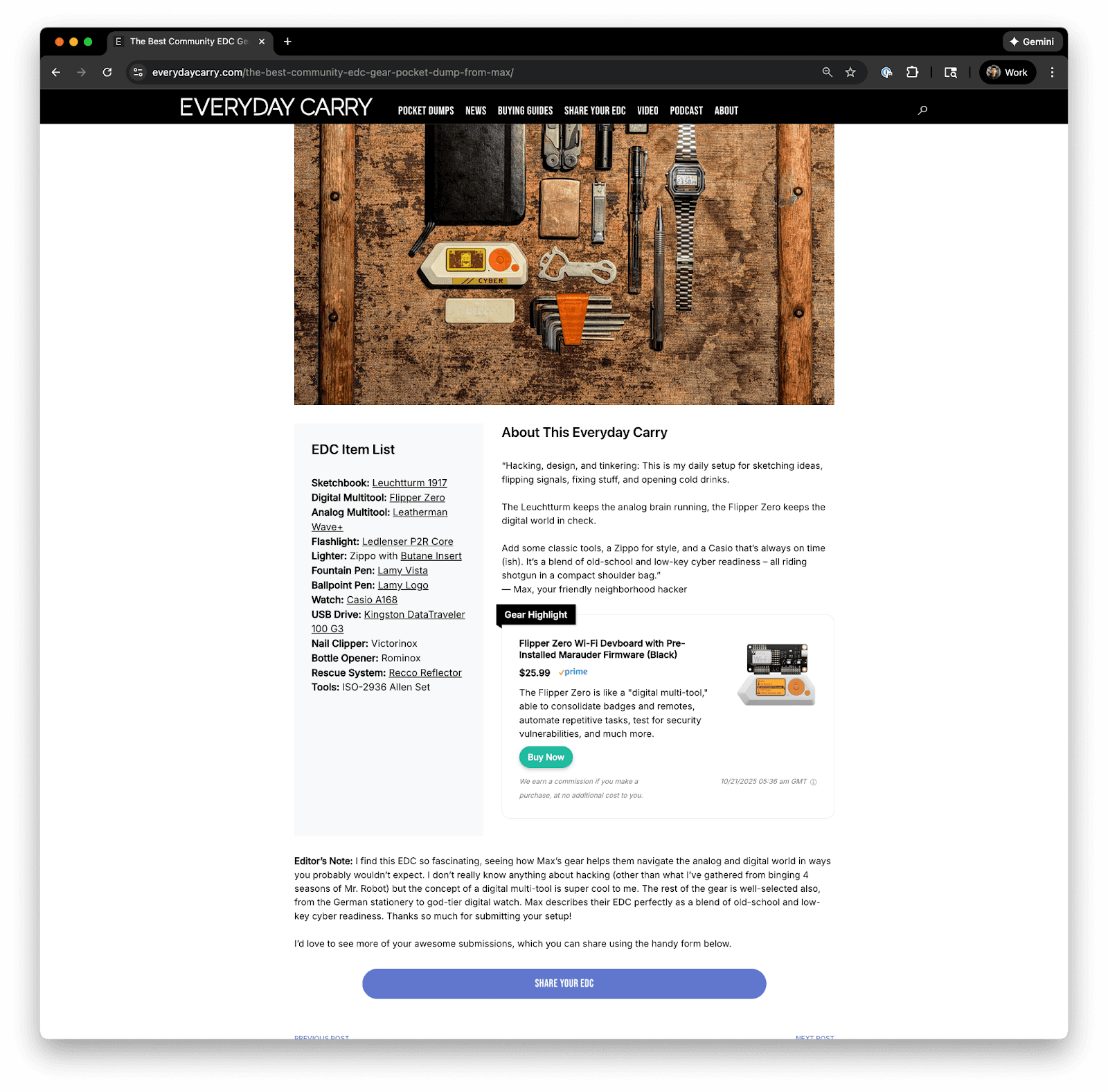 The reframe was this: a real person’s curated carry is a product recommendation. It’s arguably more credible than anything I could write in a buying guide, because it’s grounded in actual use. A software engineer’s daily carry tells you something about what a Flipper Zero is actually good for in a way a spec sheet never could.