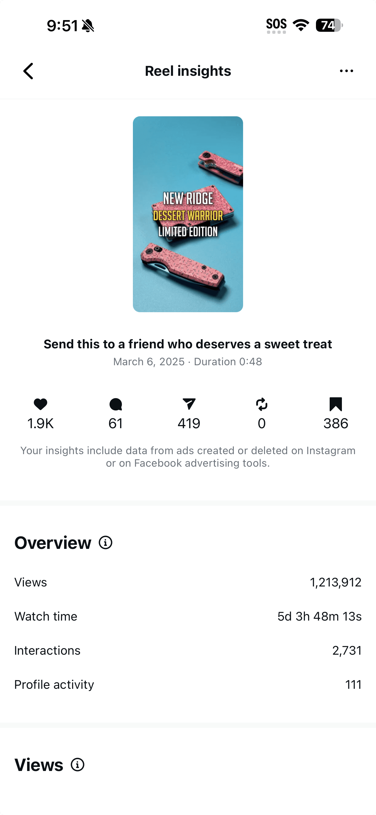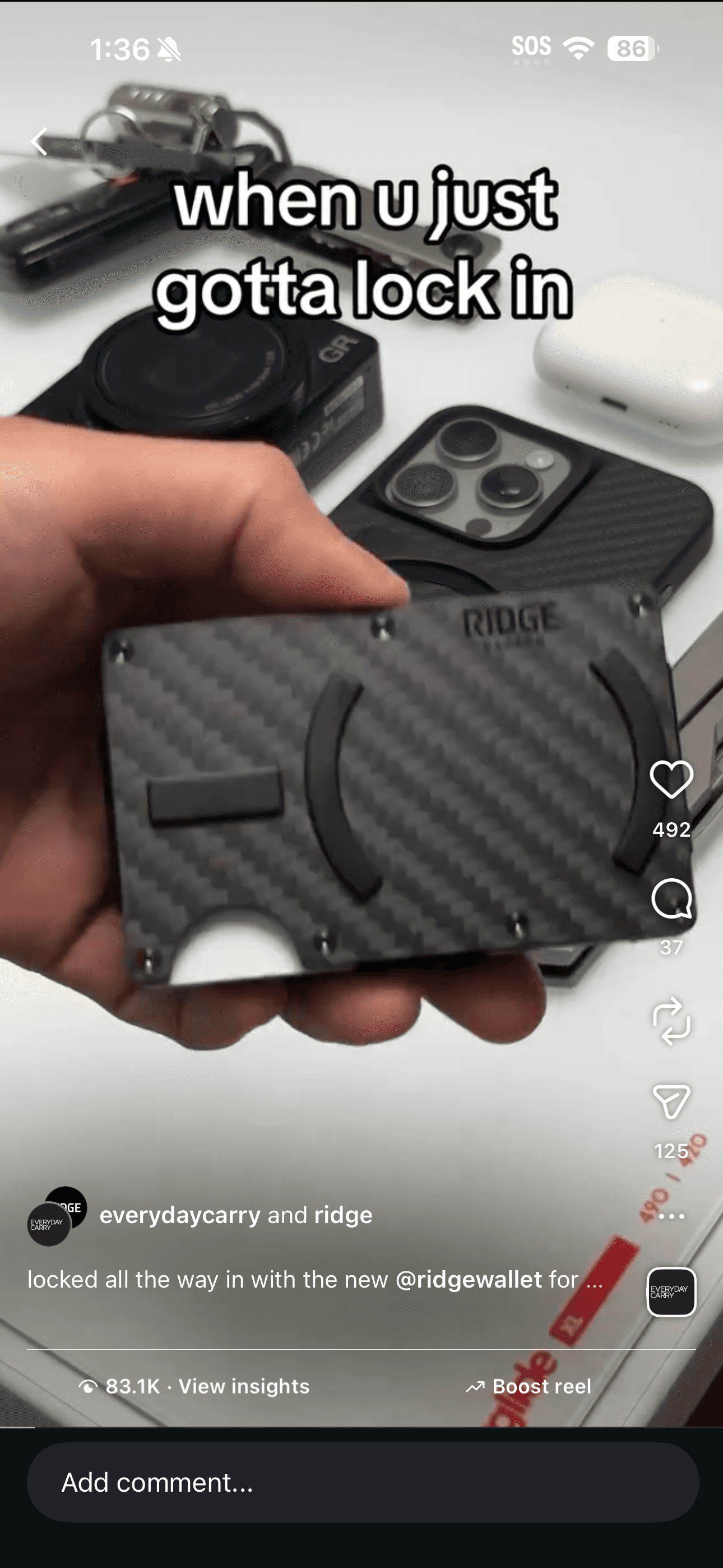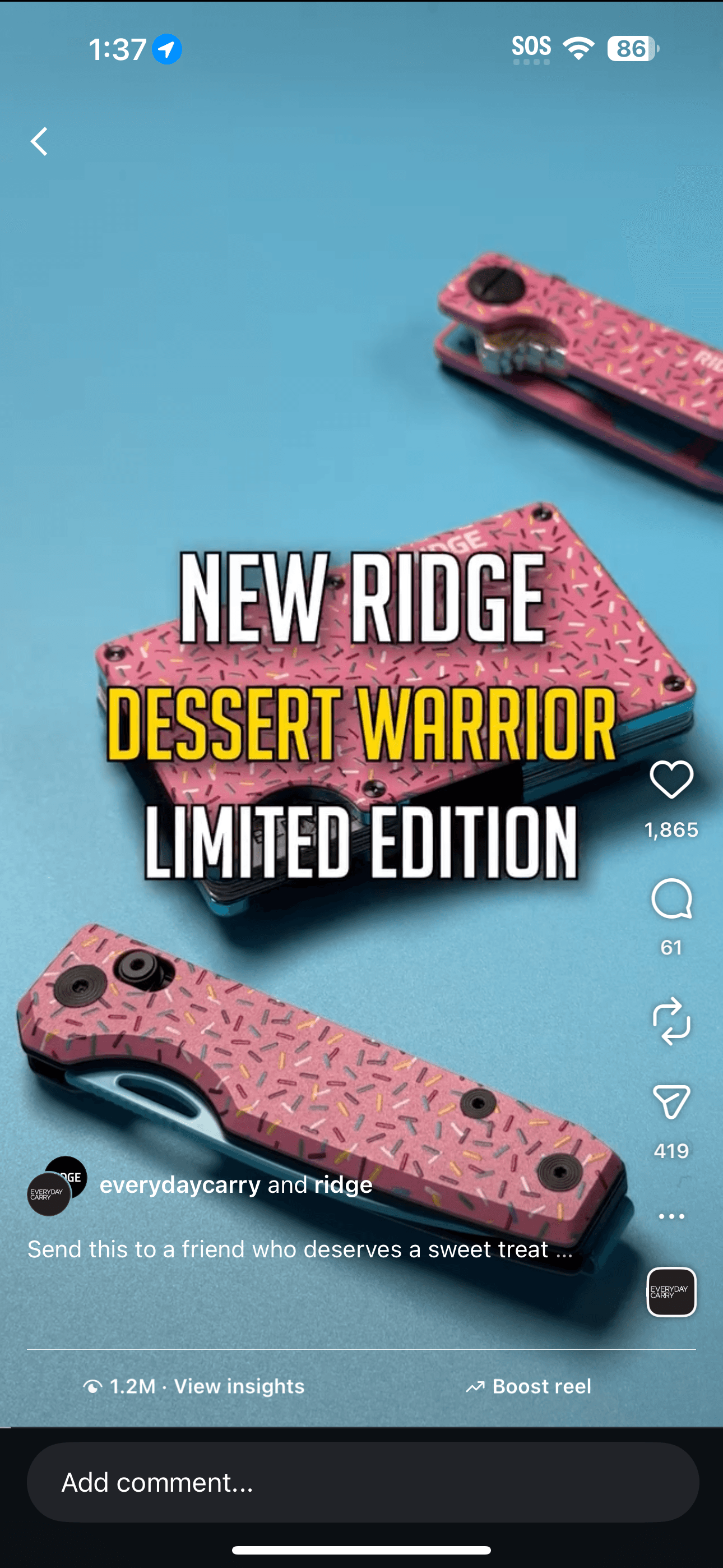 The Instagram Reel, whitelisted from the EDC handle, reached 1.2 million views. Ridge’s own Facebook video for the same drop hit 286,000 views. Three launches. Same playbook. Each one sharper than the last.