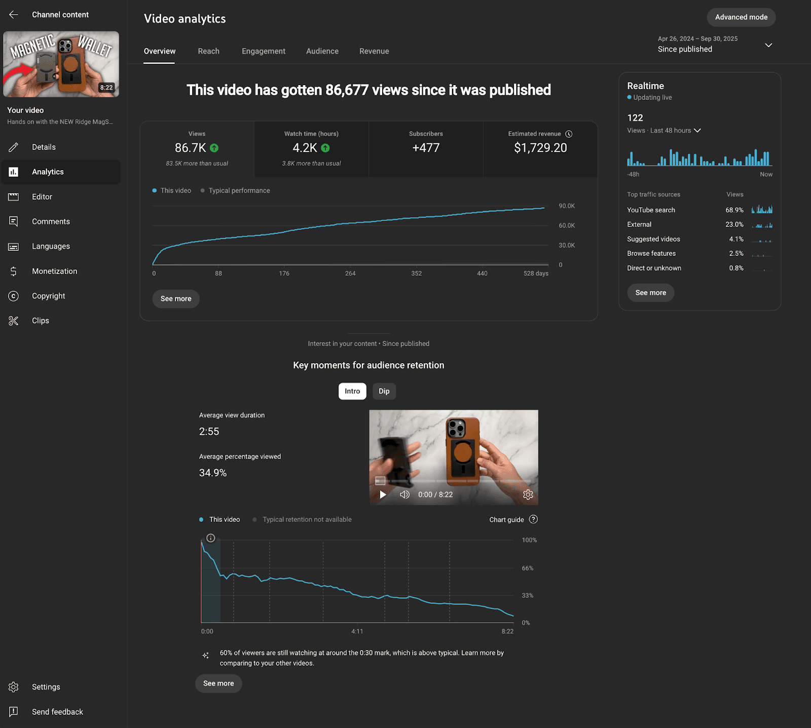 The YouTube review pulled 86,247 views with an 8.3% click-through rate. Average view duration was 2 minutes 55 seconds—34.9% of the video. For a product review, that’s not someone who clicked and left. That’s someone who stayed to actually learn about the product. 4,201 hours of total watch time.